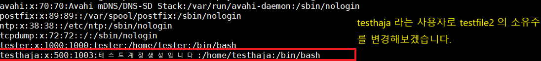 tesfile2 파일의 그룹이 root에서 testhaja로 변경된 것을 확인할 수 있습니다.