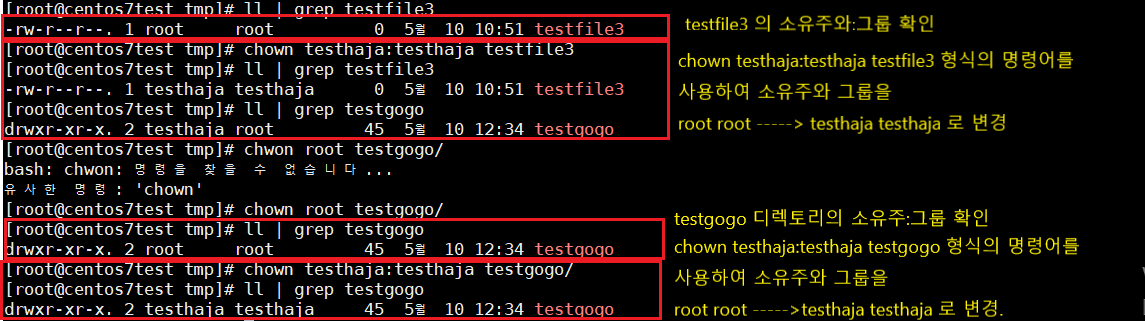 chown -R testhaja testgogo처럼 R 옵션을 주면 디렉터리 안의 파일들의 소유권도 동일하게 testhaja로 변경됩니다.
