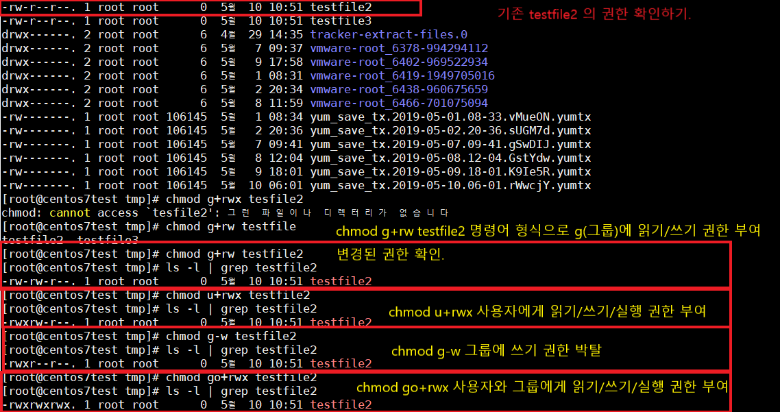 개별단위 변경 (chmod g+rw/go+rwx testfile2)